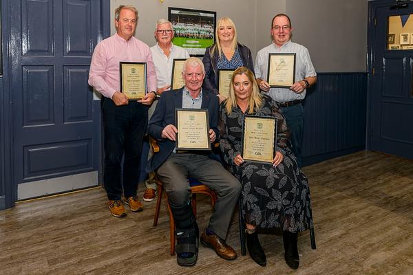 Back Row (l-r): Alan Cunningham, Eric Lennon, Carmel Butler, Padraig MacCormaic accepting on behalf of Pat O'Connell. Front Row (l-r): Mike 'Ginger' Roughan and Jean accepting on behalf of John 'Batty' Considine RIP