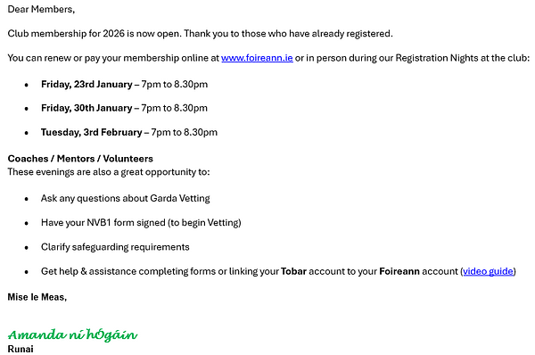 You can renew or pay your membership online at www.foireann.ie or in person during our Registration Nights at the club: