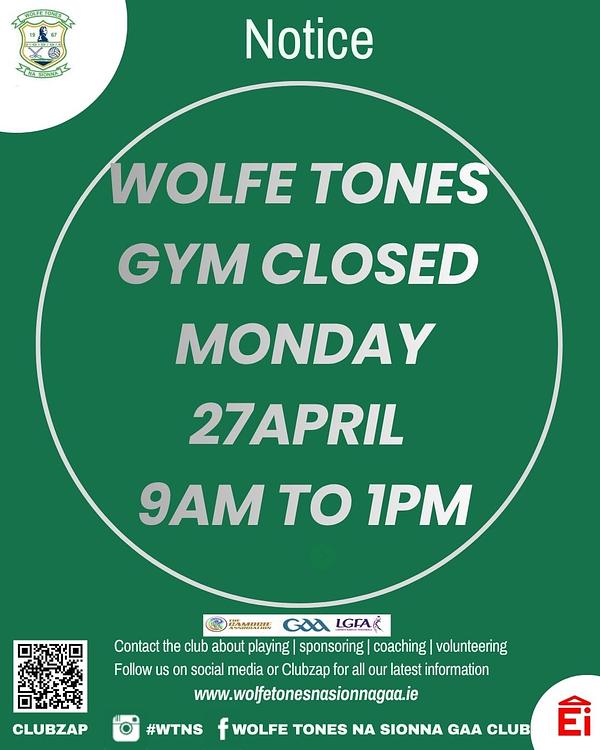 Wolfe tones gym closed Monday 27th at 9am to 1pm